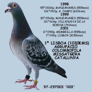 Una inteligente hembra azul pluma blanca con ojo blanco, que logró en 1999 el premio que todo colombófilo que le gustan las sueltas de gran fondo, yo soy uno de ellos, quiere tener en sus vitrinas. Obtuvo el PRIMER PREMIO de la suelta reina de Catalunya, LISBOA 1030 Kms . Esta suelta se realiza el mismo día que la clásica internacional del Barcelona para los Belgas, Holandeses, Alemanes, etc. además para muchos con igual distancia. Se soltaron las palomas el primer viernes de julio de 1999 desde Lisboa (Portugal) a las 7,30 horas.El día fue muy caluroso, con temperaturas en el centro de España de unos 42–45 grados, teniendo que superar varios sistemas montañosos y sabedores todos de la poca agua que hay en la península Ibérica. Se comprobó al día siguiente a las 7h. 47´08¨ fue la única paloma que superó los 1000 m/m. Obtuvo una velocidad de 1046 m/m. Superó en tiempo a la segunda paloma comprobada en dos horas y cuarenta y dos minutos.